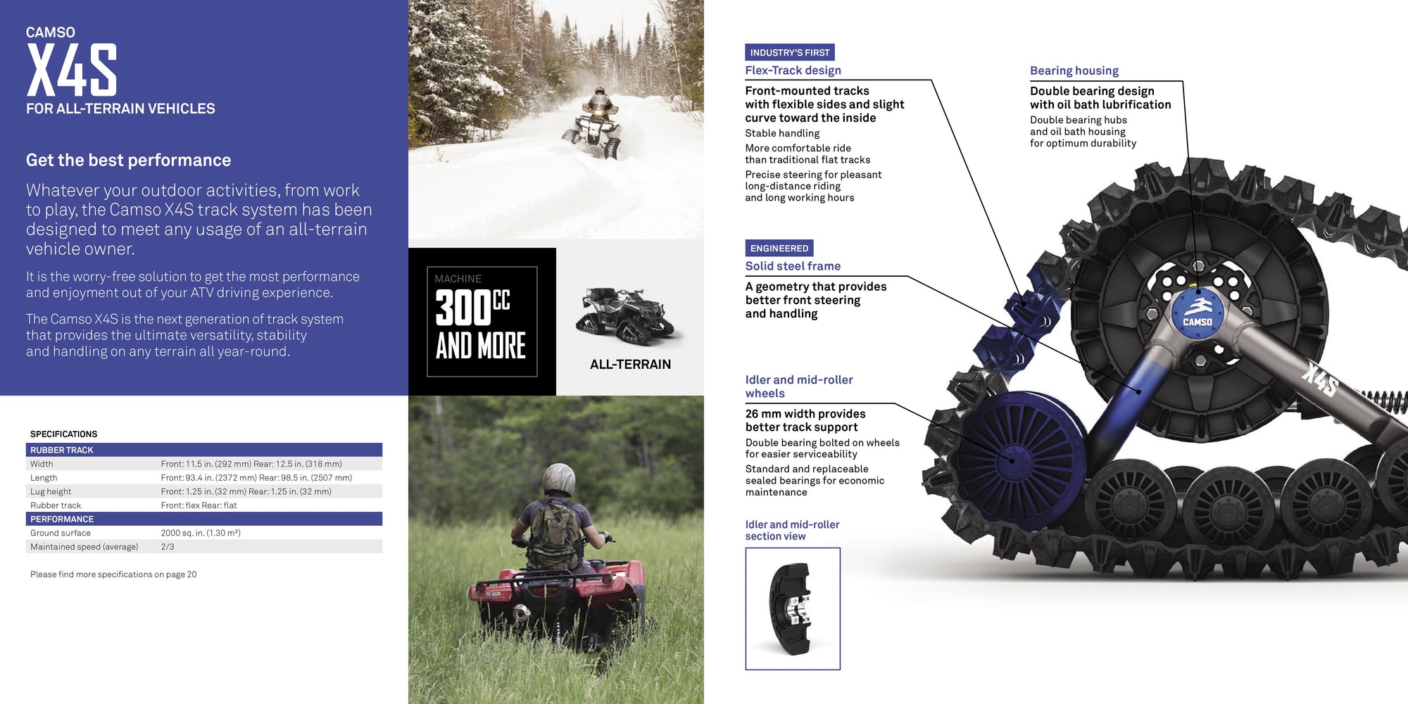 The Camso X4S comes with adapted mount kits to fit most popular ATV such as theYamaha Grizzly, theCan-Am Outlander, and thePolaris Sportsman, as well as mid-size UTV models like theHonda Pioneer, thePolaris Ranger, and theYamaha Viking.
