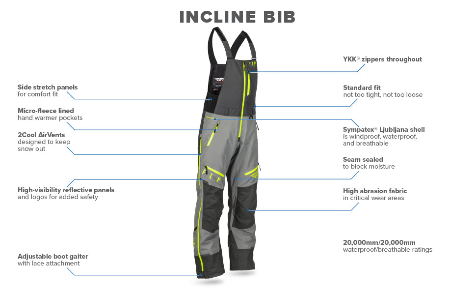 The Fly Racing Incline Snow Bib delivers premium protection, comfort, and performance for men navigating extreme winter conditions. Built with a high-end Sympatex shell, these snow pants provide 20,000mm waterproof and breathable ratings and fully seam-sealed construction to block wind and moisture. Reinforced high-abrasion fabrics in critical wear areas, along with side stretch panels, combine durability with mobility for skiing, snowboarding, snowmobiling, or ice fishing. Adjustable shoulder straps and elastic lace boot gaiters ensure a tailored fit, while 2Cool Air mesh vents and micro-fleece hand warmer pockets enhance ventilation and comfort. Premium features like a chest pocket, tether D-ring, reflective panels, and durable YKK® zippers provide convenience, safety, and reliable use in harsh winter environments. Designed with a standard fit, these mens snow bibs offer high-performance protection, premium features, and long-lasting durability for outdoor winter adventures.