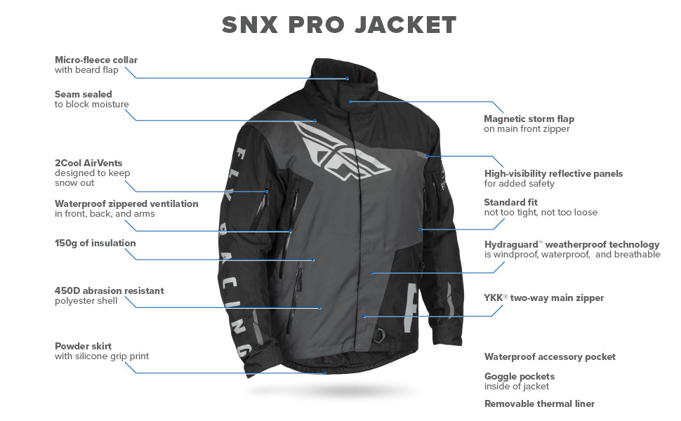 The Fly Racing SNX Pro Snow Jacket delivers the perfect balance of durability, weatherproofing, and comfort for snowmobile and winter sports riders. Built with a 450D abrasion-resistant polyester shell and a 140g insulated thermal liner (removable in adult models, is not removable in youth), this men’s winter jacket keeps you warm without compromising mobility. Featuring Hydraguard weatherproof technology with a 10,000mm/6,000m² waterproof and breathable membrane, the SNX Pro keeps you dry and windproof in even the harshest snow conditions. Waterproof zippered vents in the front, back, and arms work alongside 2Cool mesh vents to regulate airflow while blocking snow. Rider comfort is enhanced with a micro-fleece lined collar, beard flap, storm flaps, and a powder skirt with silicone grip to seal out cold. Safety and convenience are built-in with 360° reflective panels, a tether D-ring, goggle pockets, a detachable goggle wipe, waterproof accessory pocket, and glove-friendly YKK two-way main zipper. Whether you’re snowmobiling, skiing, or snowboarding, the SNX Pro Snow Jacket is built to perform in every condition.