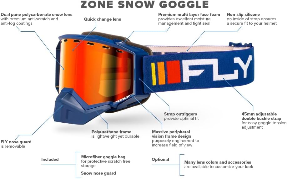 The Fly Racing Zone Snow Goggles deliver clarity, comfort, and performance for skiing, snowboarding, and snowmobiling in demanding winter conditions. Designed with a dual-pane polycarbonate snow lens, these ski goggles feature premium anti-scratch and anti-fog coatings that provide reliable vision in cold, wet, and fast-changing environments. A lightweight yet durable polyurethane frame is engineered for maximum peripheral vision, giving you a wider field of view whether carving slopes or riding trails. Premium multilayer face foam ensures a comfortable, sealed fit against your face. Outriggers provide added stability and help the goggles sit perfectly with your ski helmet or snowmobile gear. With a quick-change lens system, riders can easily swap in optional lens colors and accessories for different light conditions. A wide 45mm silicone-backed strap keeps the goggles secure, while the removable nose guard adds extra protection. Includes a microfiber bag for storage and cleaning.