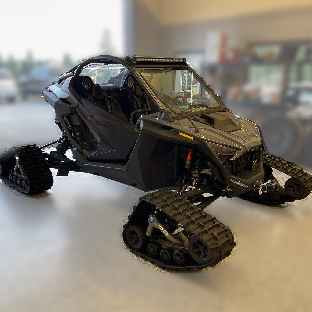 Trax Brax Mounting kit for Polaris RZR Pro R. Comes with front brackets, rear brackets, Geometry change brackets for anti-rotation arms and All grade 8 and higher bolts and hardware needed to install. A link to step-by-step instructions is also included. Make sure you check the owners manual for your track kit to see if this front bracket kit fits your machine.